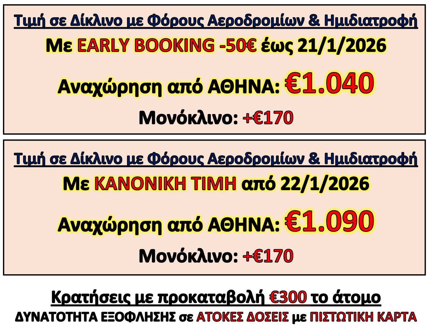 Για αναχωρήσεις από Θεσσαλονίκη (ή άλλες πόλεις της Ελλάδας), παρακαλούμε επικοινωνήστε μαζί μας. Τιμές βάσει διαθεσιμότητας.