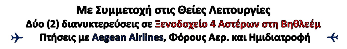 Πολύ πρωινή μετάβαση στην Βηθλεέμ. Στην Βασιλική της Γεννήσεως (από την εποχή του Ιουστινιανού), θα συμμετάσχουμε στην κατανυκτική Θεία Λειτουργεία, στο Ιερό Σπήλαιο της Γεννήσεως.