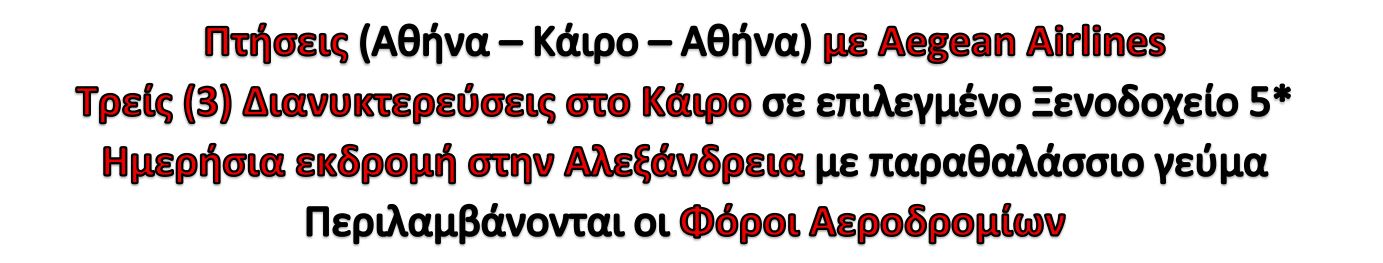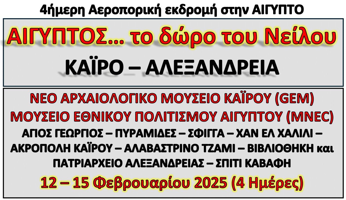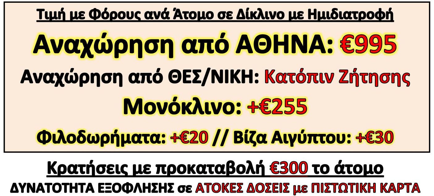Συνάντηση στο Ελευθέριος Βενιζέλος στις 05.15 στο γκισέ της Aegean στις αναχωρήσεις. Παράδοση αποσκευών, έλεγχος διαβατηρίων και αναχώρηση προς Κάιρο (A3-932) στις 07.05 με άφιξη στις 09.00 (ώρα τοπική).