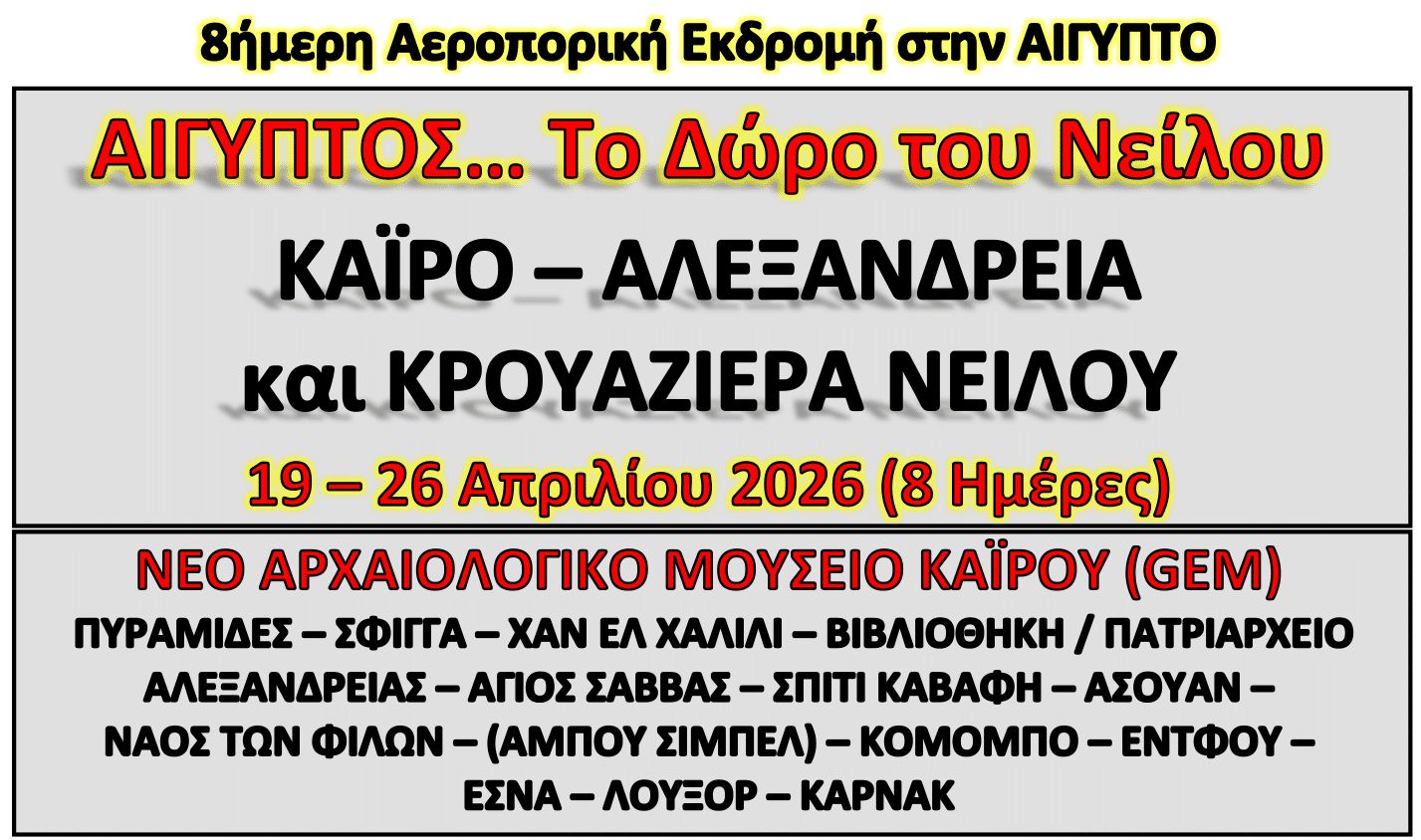 Επίσκεψη στο Νέο Αρχαιολογικό Μουσείο στο Καΐρο (Grand Egyptian Museum Of Cairo – GEM) στην Γκίζα το οποίο θεωρείται το νέο στολίδι του στέμματος της Αιγύπτου, αλλά είναι επίσης ένα από τα μεγαλύτερα και πιο σύγχρονα μουσεία σε ολόκληρο τον κόσμο. Φιλοξενεί πληθώρα τεχνουργημάτων της αρχαίας Αιγύπτου, συμπεριλαμβανομένων των θησαυρών του τάφου του Τουταγχαμών, ενώ πολλά από τα εκθέματα εκτίθενται για πρώτη φορά στο ευρύ κοινό.