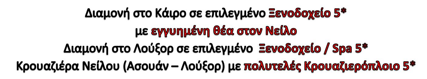 Σημείωση: Βραδινή προαιρετική Κρουαζιέρα στον Νείλο (21.00-23.00) με ποταμόπλοιο 5*. Περιλαμβάνονται: μεταφορά, φαγητό σε μπουφέ, γλυκό, διασκέδαση με ζωντανή ανατολίτικη παραδοσιακή μουσική, χορός Δερβίση, χορός της κοιλιάς και παραδοσιακοί χοροί από χορευτικό συγκρότημα με παραδοσιακές φορεσιές.