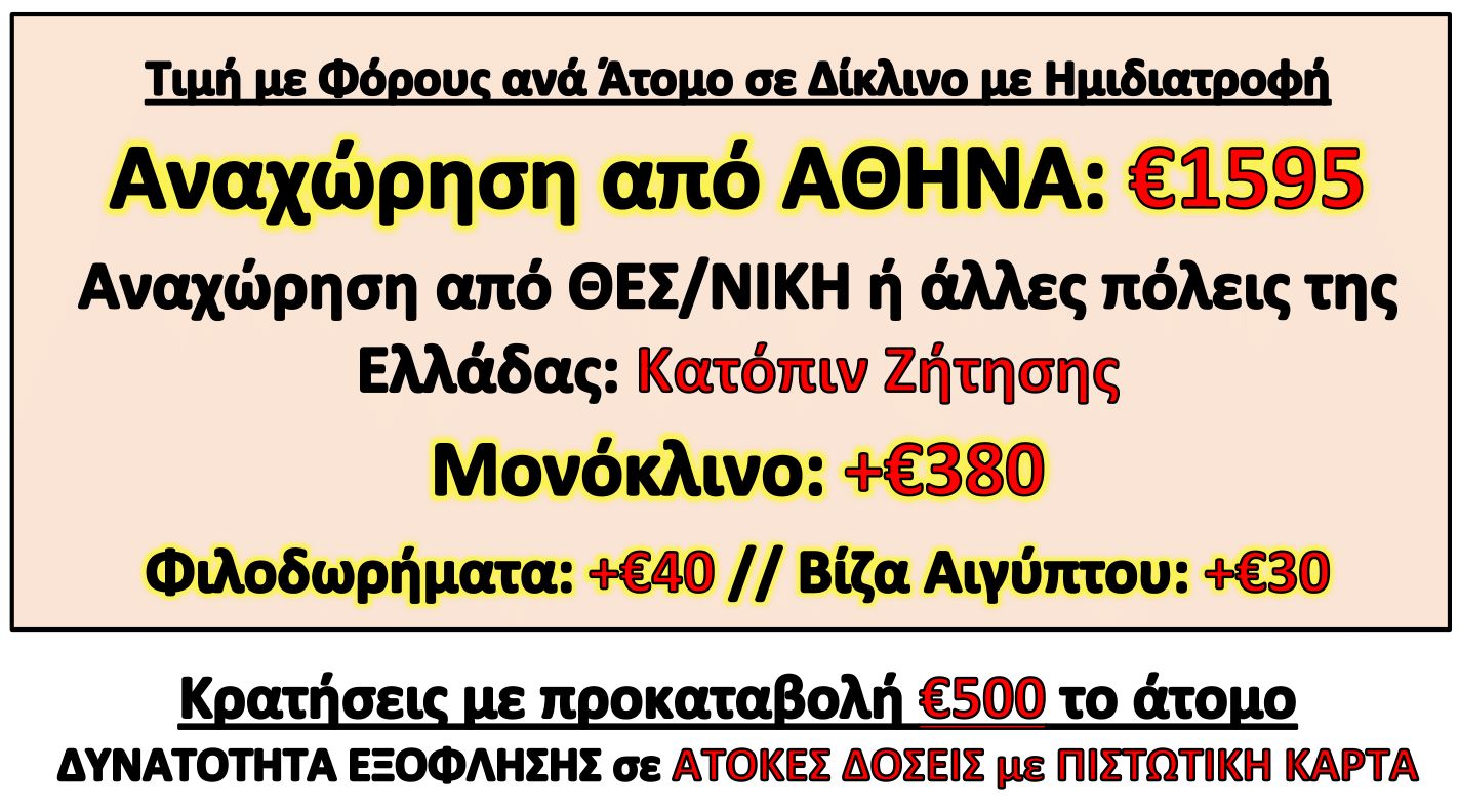 Σημείωση: Το απόγευμα μετά τις φελούκες, προαιρετική επίσκεψη σε Νουβιακό χωριό και προαιρετική βόλτα με καμήλες στην έρημο.