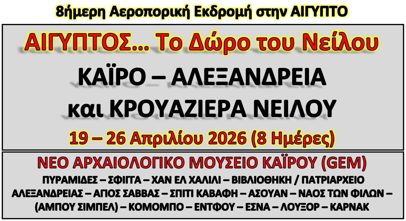 Συνάντηση στις 11.10 με τον εκπρόσωπο του γραφείου μας μας στο αεροδρόμιο Ελευθέριος Βενιζέλος της Αθήνας, στο γκισέ της Egypt Air. Παράδοση αποσκευών, έλεγχος διαβατηρίων και χειραποσκευών. Πτήση (ΜS-748) προς το Διεθνές Αεροδρόμιο Καΐρου στις 13.10 με άφιξη στις 14.05 (τοπική ώρα).