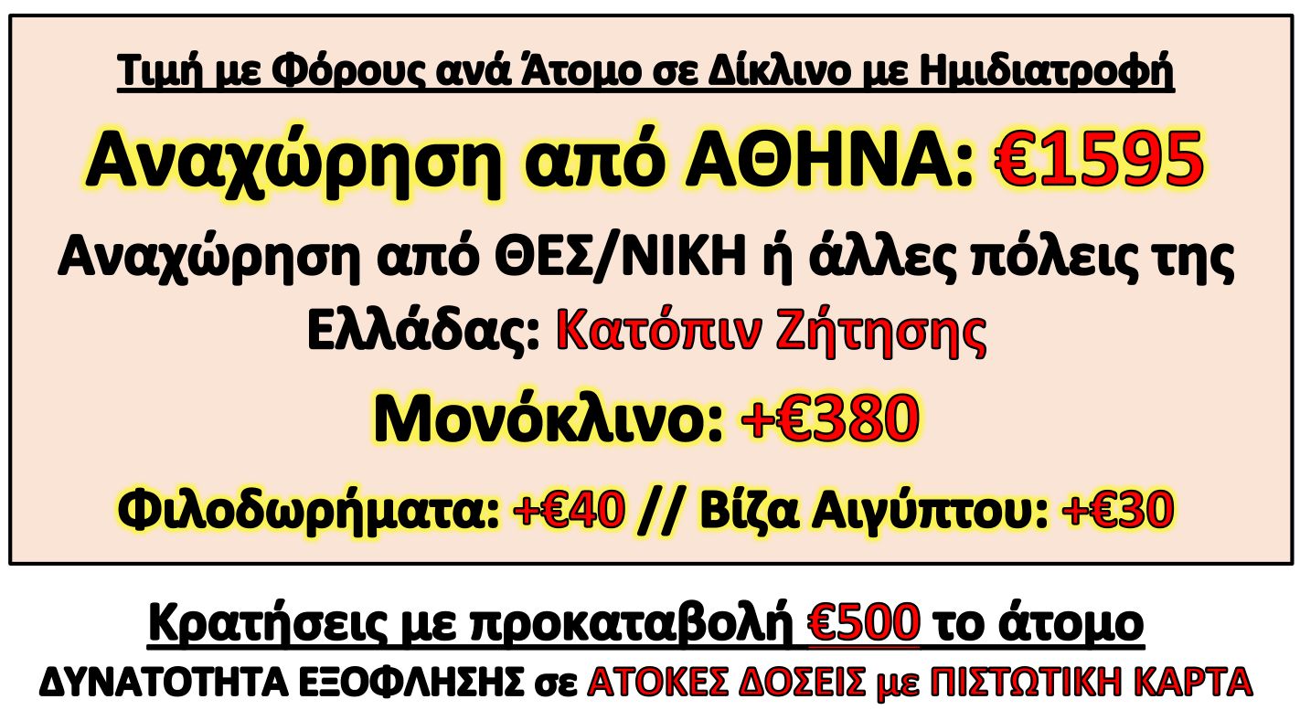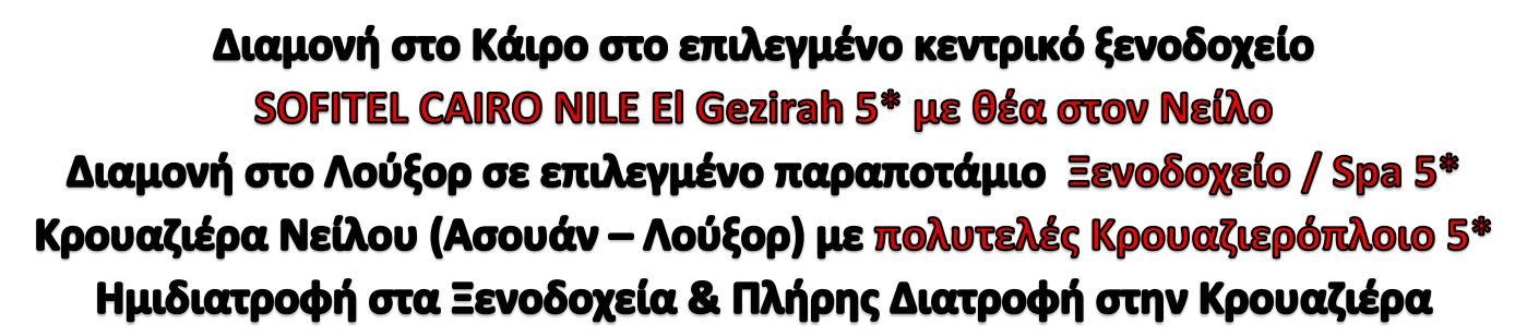 Σημείωση: Βραδινή προαιρετική Κρουαζιέρα στον Νείλο (21.00-23.00) με ποταμόπλοιο 5*. Περιλαμβάνονται: μεταφορά, φαγητό σε μπουφέ με επιδόρπιο, διασκέδαση με ζωντανή ανατολίτικη παραδοσιακή μουσική, χορός Δερβίση, χορός της κοιλιάς και παραδοσιακοί χοροί από χορευτικό συγκρότημα με παραδοσιακές φορεσιές.