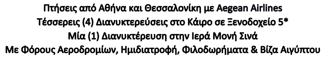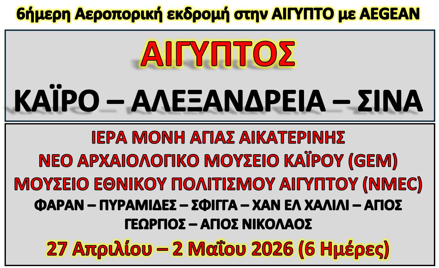 Συνάντηση στο αεροδρόμιο Μακεδονία της Θεσσαλονίκης, στις 13.00. Παράδοση αποσκευών και πτήση με την Aegean Airlines (A3-117) στις 14.45 για Αθήνα με άφιξη στις 08.40. Ακολούθως πτήση για Κάιρο (A3-934) στις 17.05 με άφιξη στις 19.05 (ώρα τοπική).