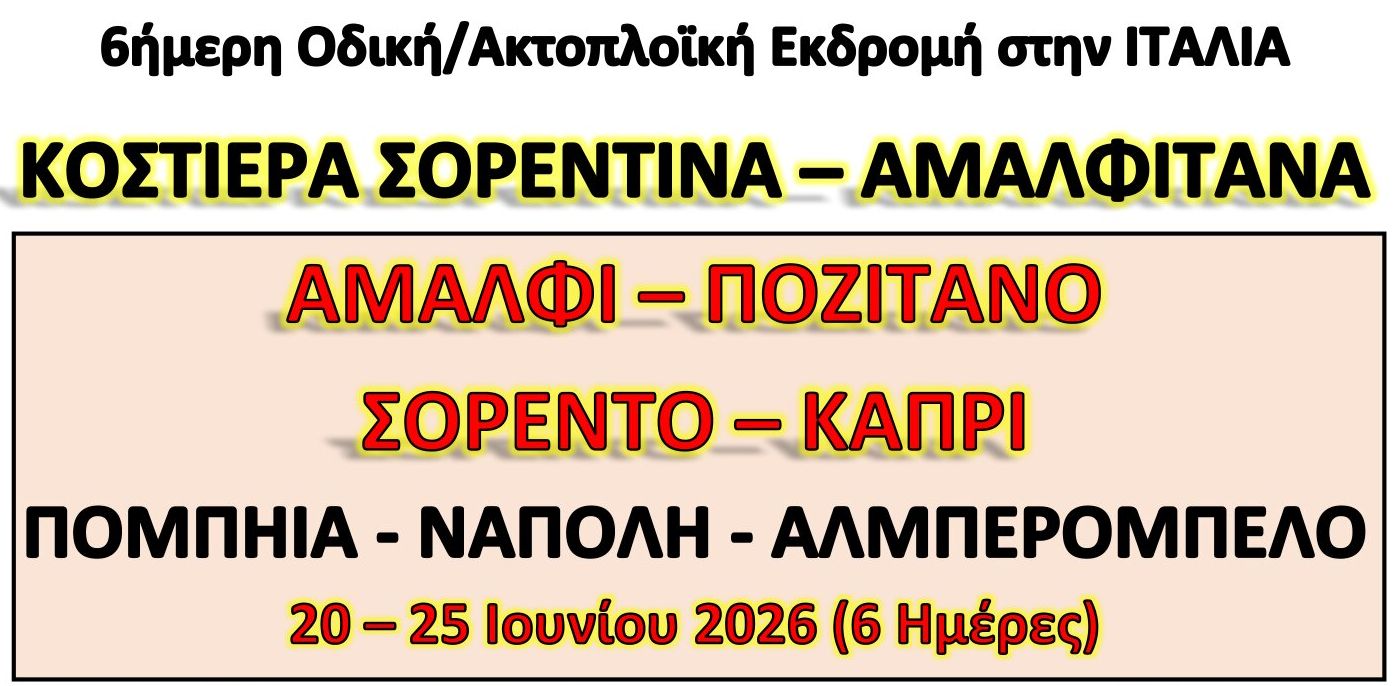 Σημείωση: Για την περίπτωση εκείνη που τα καραβάκια λόγω καιρικών συνθηκών δεν θα πραγματοποιούν τα δρομολόγιά τους, θα επισκεφθούμε το Αμάλφι και το Ποζιτάνο οδικώς.