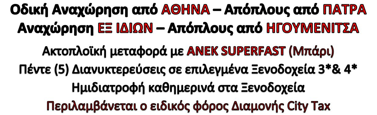 Άφιξη πρωινή στο λιμάνι της Ηγουμενίτσας (05.30) και στο λιμάνι της Πάτρας στις 13.00. Επιστροφή οδικώς στην Αθήνα με ενδιάμεσους σταθμούς.
