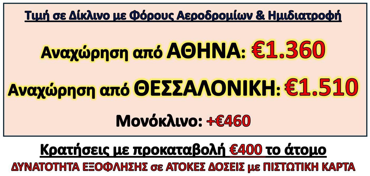 Συνάντηση με τον εκπρόσωπο του γραφείου μας στο αεροδρόμιο Ελευθέριος Βενιζέλος της Αθήνας, στις 18.00, στις αναχωρήσεις.